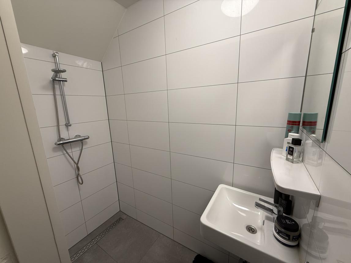 - De woonkamer en slaapkamer zijn voorzien van een houten vloer, overige ruimtes zijn voorzien van een tegelvloer;