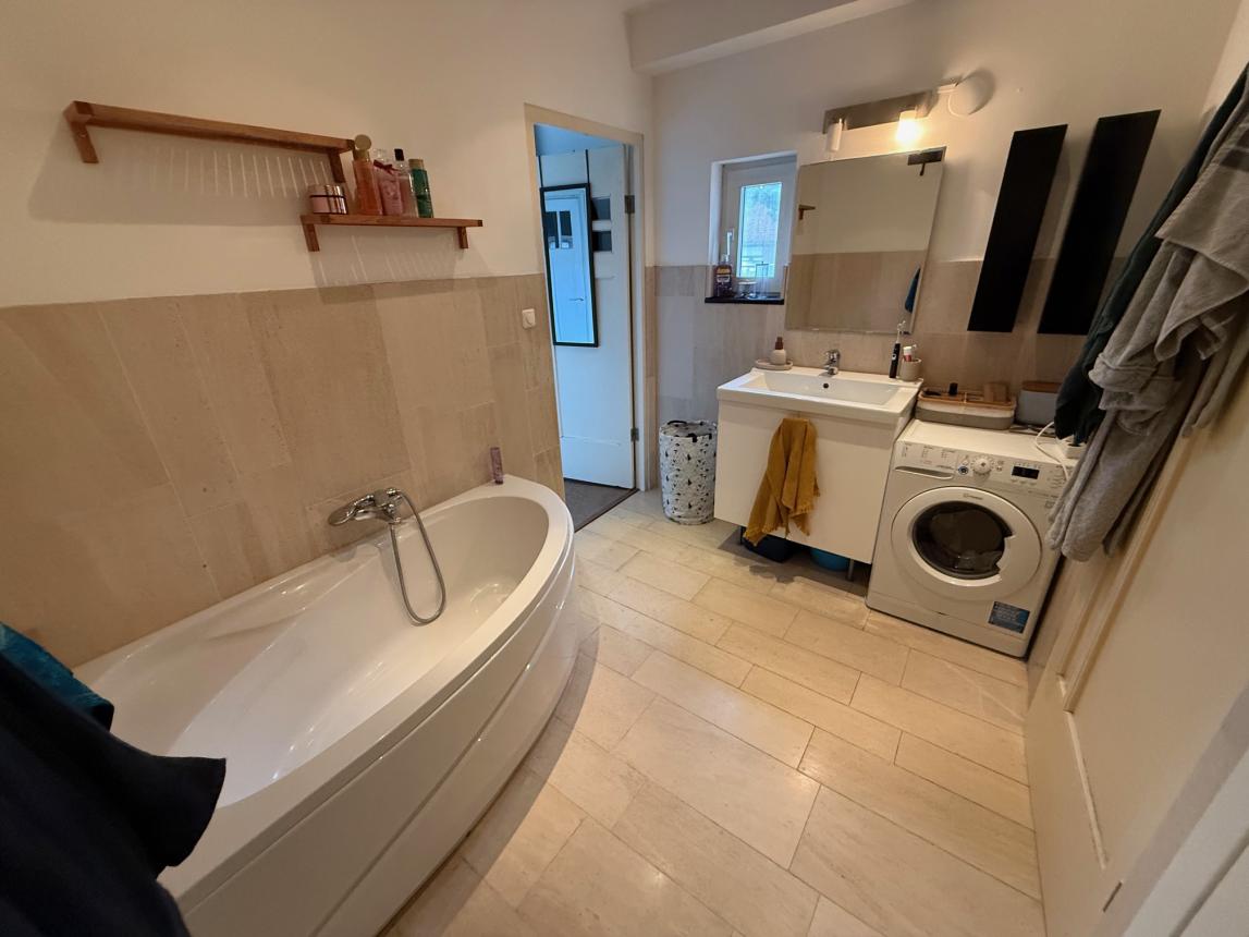 This apartment is located on the first floor. This apartment has a bedroom (16 m2), bathroom with shower and bath (9 m2) and separate toilet. The spacious living room (24 m2) is the heart of this house, on one side is the (closed) kitchen (6 m2) and the other side is the balcony (8 m2), which can be reached through French doors.